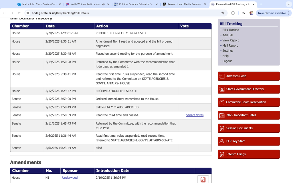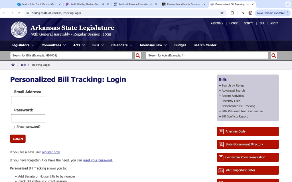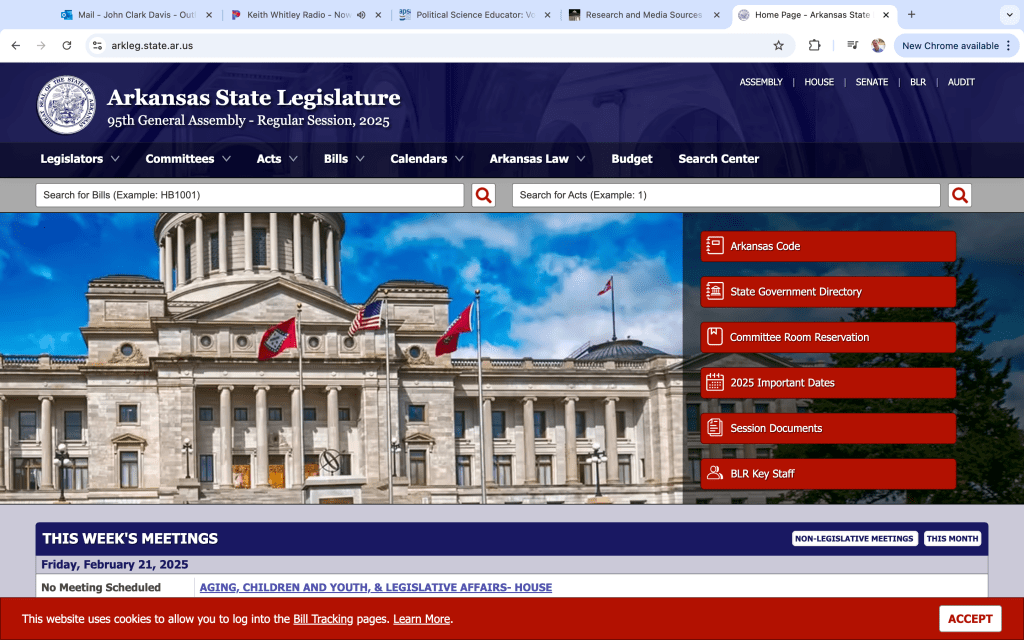 The Arkansas General Assembly gaveled into a general session last month. This semester, I have the privilege of teaching Arkansas Politics to a wonderful group of students, and we’ve been closely following the legislative process out of Little Rock. I wanted to share with my students a step-by-step guide on how to research and track legislation in real time and thought this might be of use to a broader audience, too. Have you ever read about a piece of legislation in the newspaper and wondered how you might be able to follow the process of that bill becoming a law? It’s true, that Arkansas is fortunate to have some wonderful sources covering the state legislature (click here for a short list of helpful sources I have collected), but did you know you could track legislation yourself? The Arkansas General Assembly boasts an accessible website for looking up bills and a free bill-tracking tool that provides you with the up-to-date status of legislation you have selected to follow and email updates.